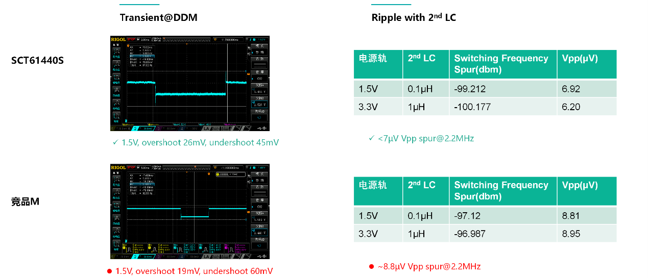 原因是由于雷達SoC發送Chirp時的快速抽載,模擬射頻部分對電源紋波十分敏感,要求供電電源擁有良好的瞬態響應,射頻供電路擁有極低的紋波及噪聲。SCT614xxS可實現穩定環路的同時有良好的環路帶寬,優化的內部降噪電路為射頻部分提供低噪聲的高精度輸出,與業界主流競品在雷達系統上實測結果對比如下: