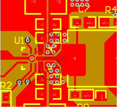 以BUCK電路為例,輸入回路所發射的磁場與電流以及輸入回路的面積成正比,輸入電流很難變小,此時盡可能減小輸入回路的面積是有效的手段。輸入電容應盡可能與功率管和基準地(續流管接地處)足夠近,使輸入回路盡可能的小,此時走線上的寄生阻抗也會變小且進一步優化,這與傳導發射中的優化一致。